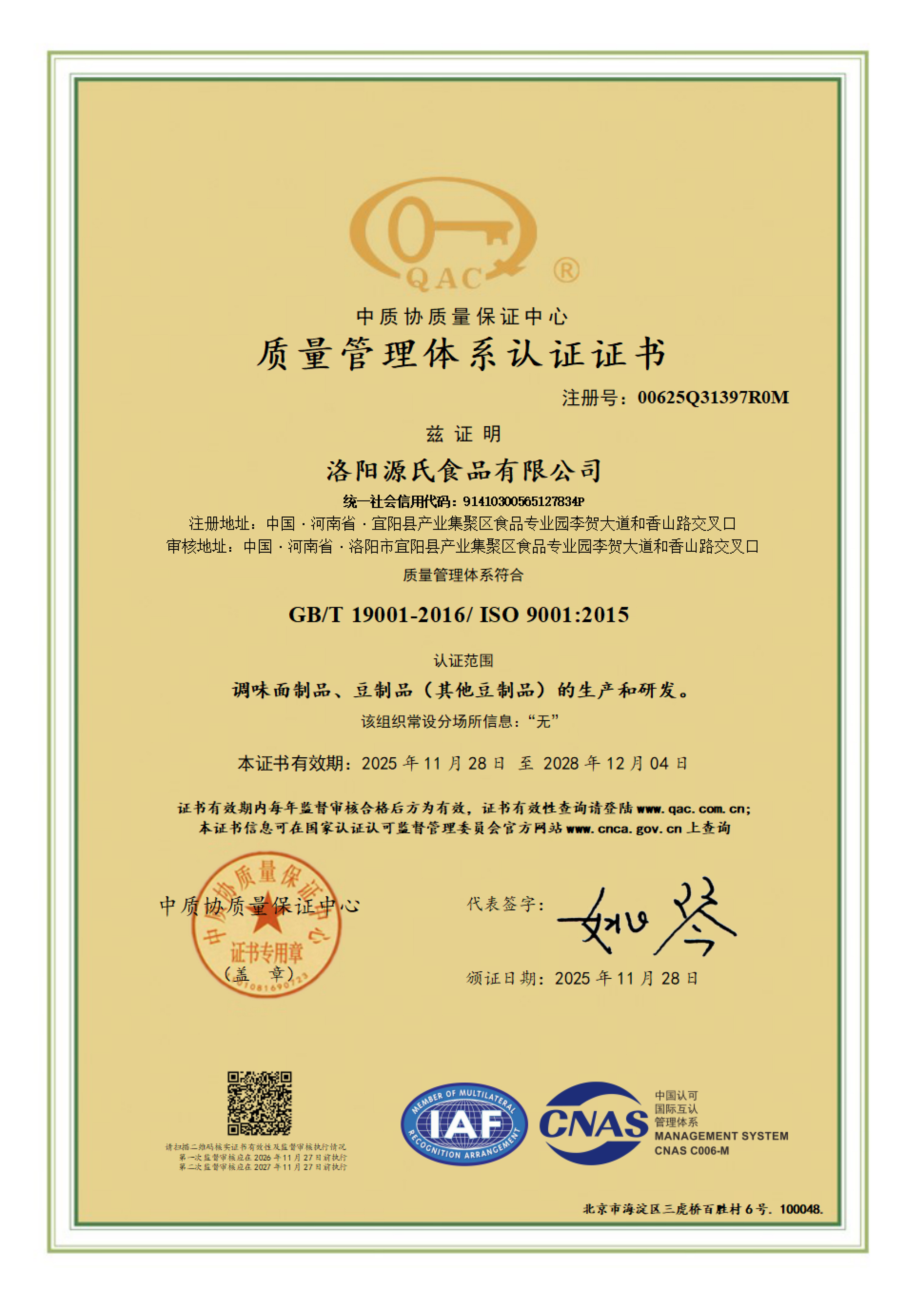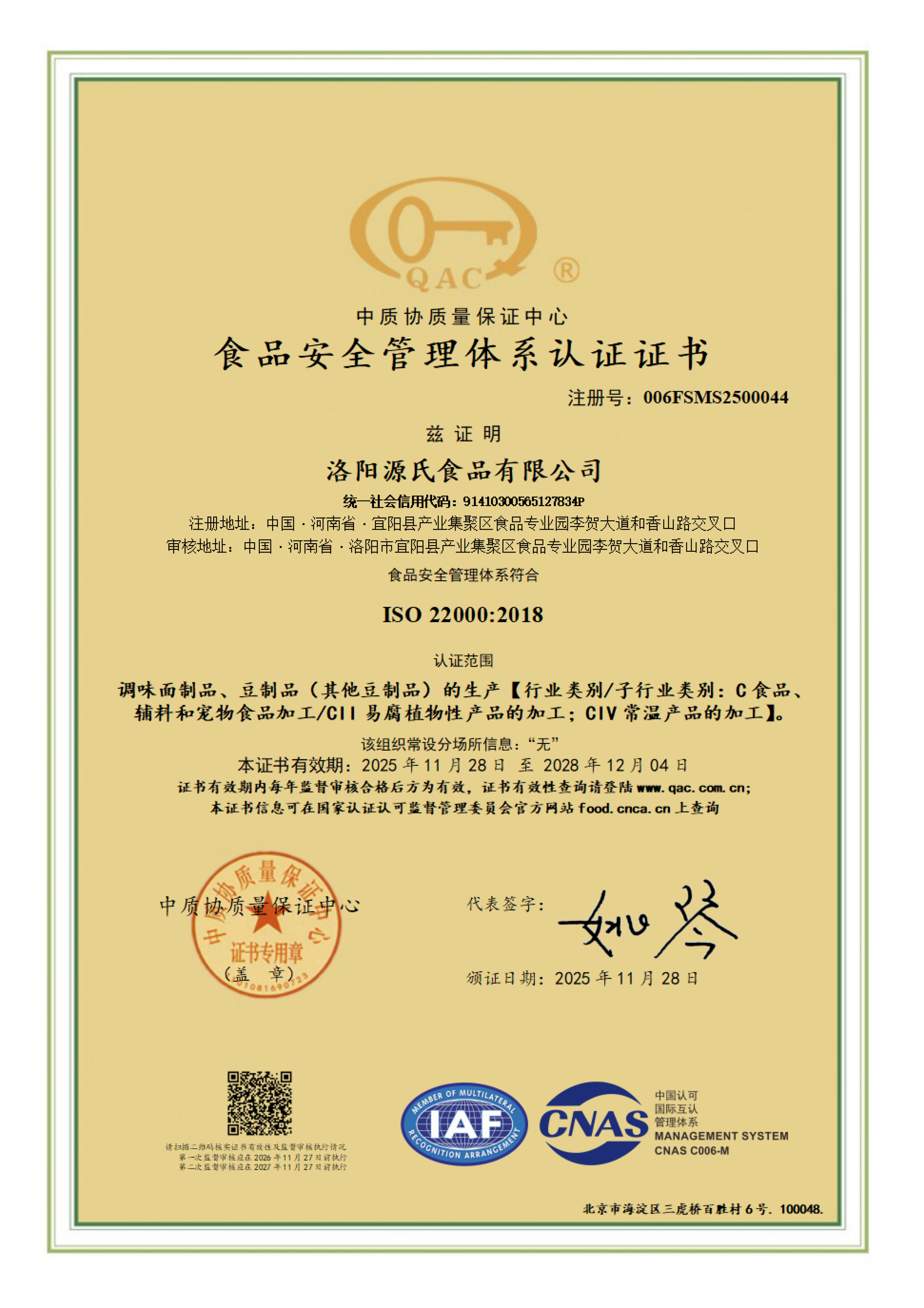 食品安全管理體系認證證書