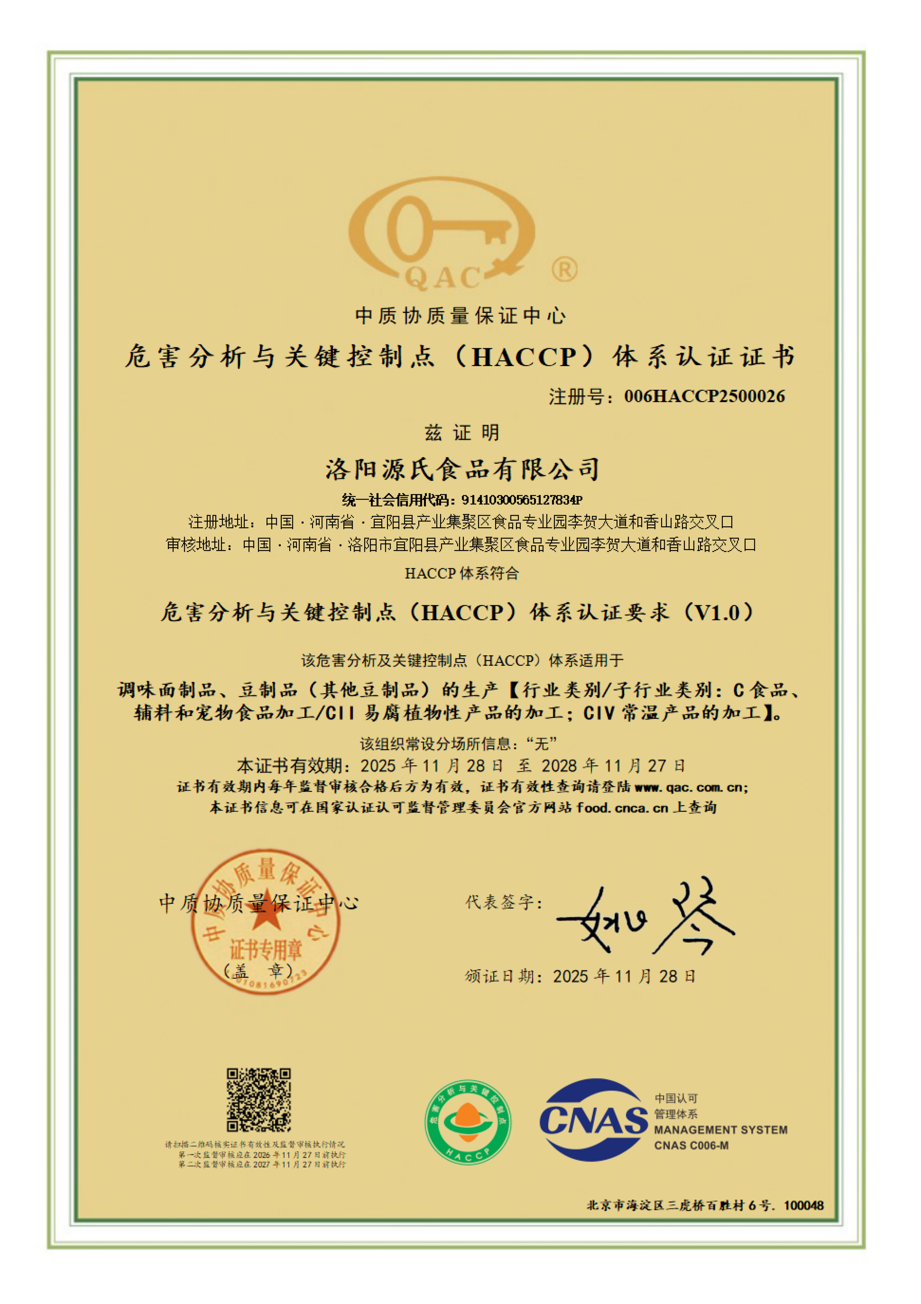 危害分析與關(guān)鍵控制點(HACCP)體系認證證書